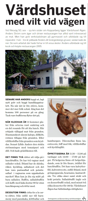Idag drivs Värdshuset Älgen med ambitionen att föra traditionen vidare – som en trivsam mötesplats där gäster kan njuta av god mat och en inbjudande atmosfär.